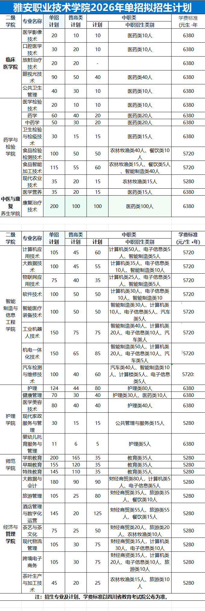 【公办】雅安职业技术学院2026年单独招生专业计划(附历年单招录取控制线)-55体育