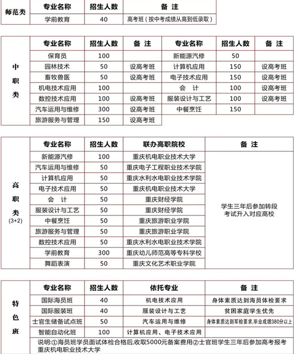 1.中职专业报考条件:重庆市内、外所有政治思想素质好,身体健康的应、往届初中毕业生均可报三年制中职所有专业;农民工、退役士兵等愿意接受中等职业教育的适龄社会青年。凡报读高职“3 2”专业的学生,必须是应届初中毕业会考成绩360分以上。