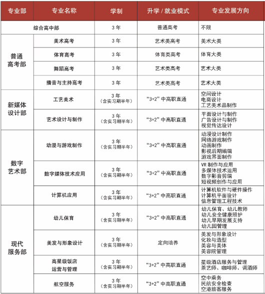 学校艺术特色鲜明。除综合高中外,学校以工艺美术为龙头,开设有普通高考类(美术、体育、舞蹈、播音主持)、工艺美术、艺术设计与制作、动漫与游戏制作、数字媒体技术应用、计算机应用、航空服务、美发与形象设计、高星级饭店运营与管理、幼儿保育等十余个专业。各个专业均为社会热门专业,市场人才需求量大。其中,综合高中发展势头良好,普通高考类专业是重庆市的王牌专业,工艺美术和动漫与游戏制作专业是重庆市龙头专业。