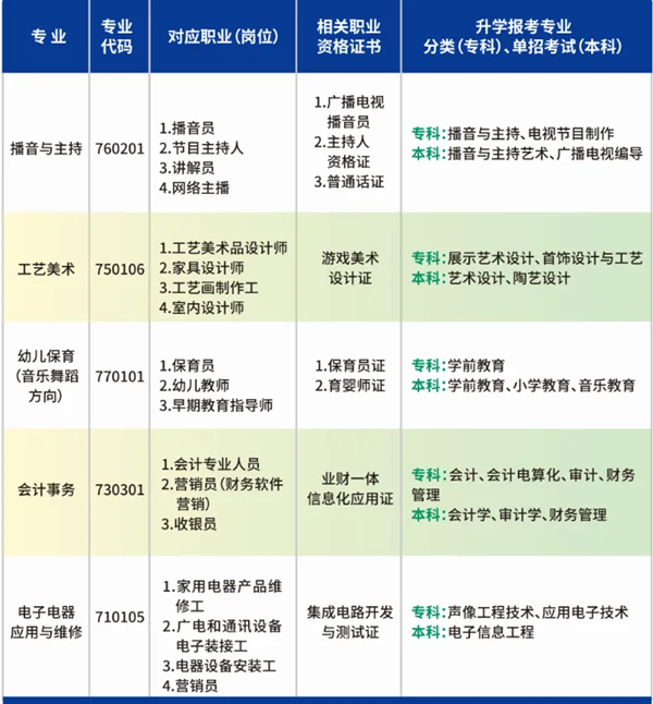 学校紧密围绕学生升学和就业,助推构建现代职业教育体系与全民终身教育体系,探寻学生多样成才道路,促进学生全面发展,为国家培养了大批具有一定专业理论和实际操作技能的中等实用技术人才。学校位于西安市雁塔区沈家桥一路,占地面积25.7亩,实训室21个,教学楼、实训楼、办公楼、宿舍楼布局合理。现有教职工117人,其中:省级教学能手2人,市级教学能手2人,区级教学能手9人,区级名师1人,“双师型”教师25人。配备思政教师5人,体育教师7人,美育教师12人,专职校医1人,心理健康教师2人。开设有幼儿保育、会计事务、电子电器应用与维修、播音与主持、工艺美术5个专业,其中:会计事务专业被西安市教育科学研究院授予“西安市中等职业学校(会计事务专业)中心组‘组长’学校”。现有教学班24个,学生1058人。学校深化产教融合、校企合作,西安亮丽仪器仪表有限公司、陕西青檬教育科技有限公司、曲江第十三幼儿园、雁塔区第十四幼儿园、新道科技股份有限公司、杭州朗讯科技有限公司、湖南金职伟业有限公司、完美世界教育有限公司等单位合作建立了实习就业基地。部分毕业生在企业的实际工作中成为企业骨干,为企业经营发展做出一定贡献。学校深化“三教”改革和西安市“名校 ”工程,与西安航天中学开展普职“名校 ”;学生通过各类型高考升入高等院校,多人先后被西安美术学院、西安音乐学院、西安工业大学、西安文理学院、咸阳师范学院、安康学院、陕西工业职业技术学院、陕西铁路工程职业技术学院、西安铁路职业技术学院、陕西财经职业技术学院等高校录取。学校与西安职业技术学院合作,设立培训基地;与陕西铁路工程职业技术学院、陕西交通职业技术学院等多所院校合作办学,实现中高职贯通,体现了我校“升学有道、就业无忧”的办学理念。